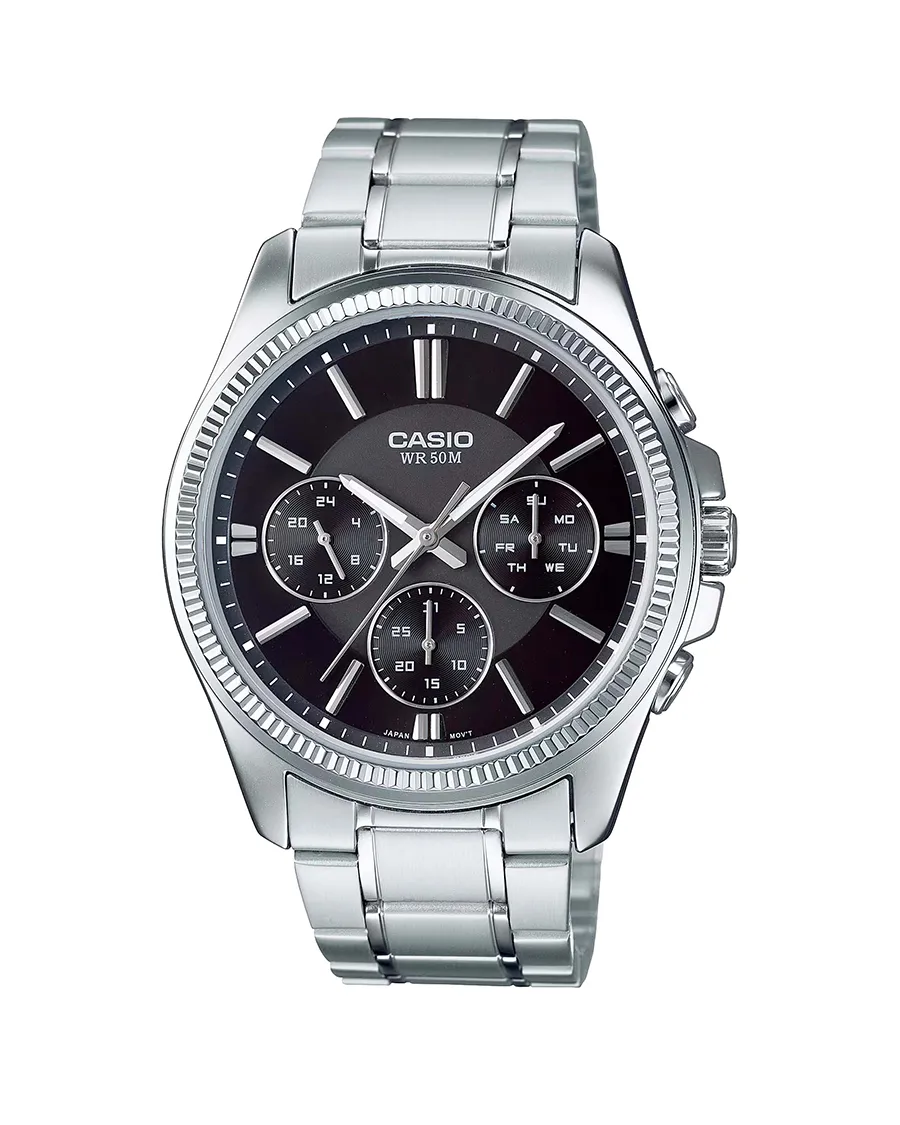 ساعت اورجینال مردانه کاسیو مدل Casio MTP-1375D-1AVDF از سه موتور فعال (3 موتوره فول تایم) بهره میبرد که علاوه بر نمایش دقیق زمان، امکان مشاهدهی تاریخ و روزهای هفته را نیز فراهم میکند. این مدل با استفاده از تکنولوژی کوارتز (باطری) کار میکند که دقت بالا و نیاز کم به نگهداری را تضمین میکند.