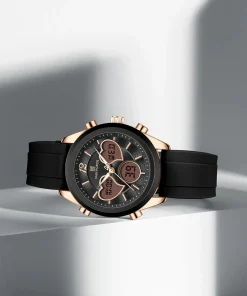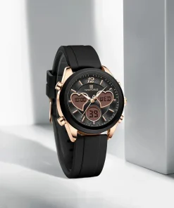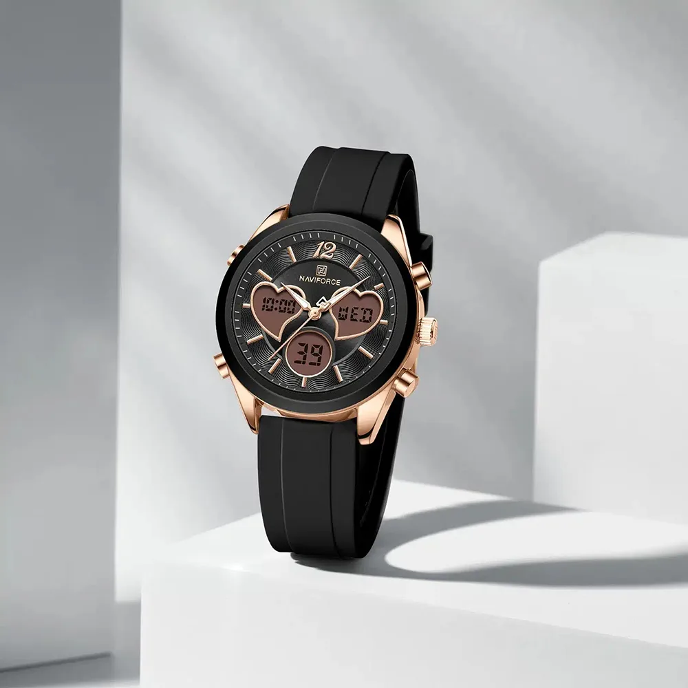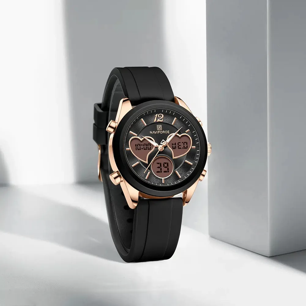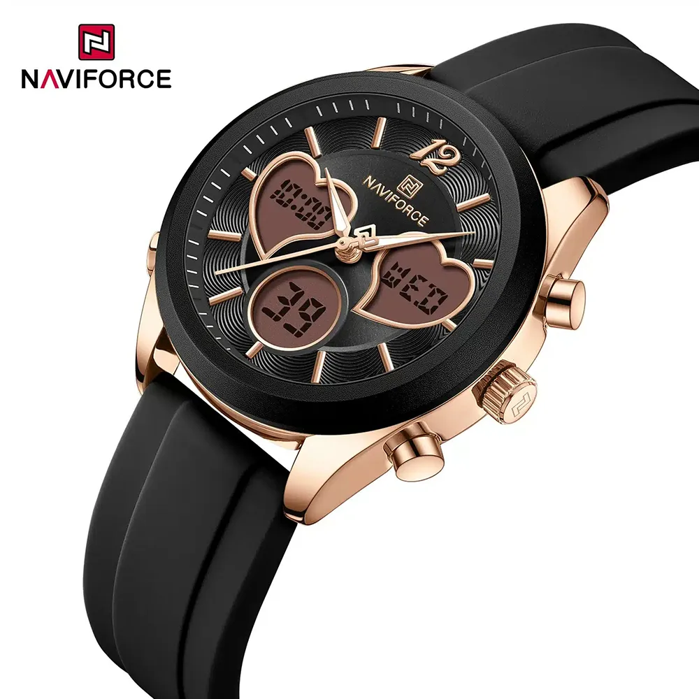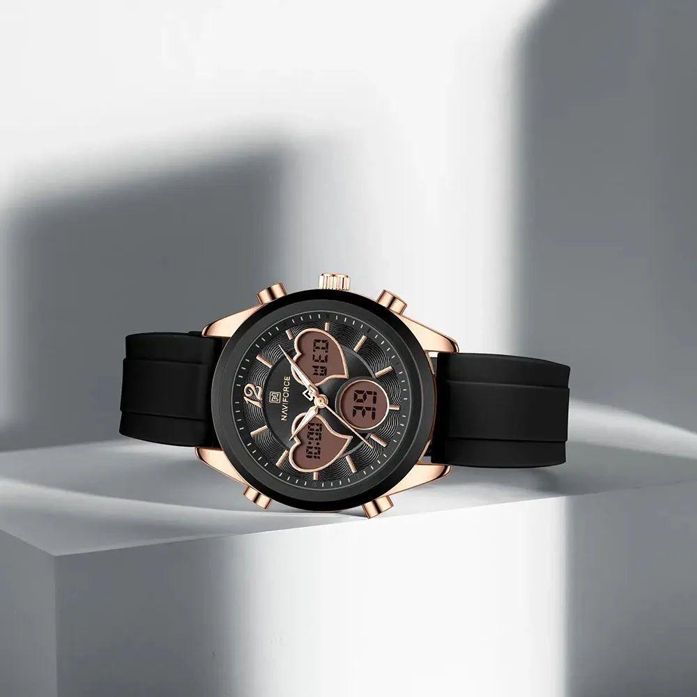 ساعت اورجینال زنانه نیوی فورس Naviforce NF5045 RG/B/B یکی از مدلهای کالکشن 2026 است که با طراحی مدرن و عملکرد دیجیتالی به بانوان شیک پوش عرضه میشود. این ساعت نیوی فورس با بند رابر سیلیکونی و قاب فلزی رزگلد، گزینهای عالی برای استفاده روزمره است. نمایش تاریخ، کرونومتر، آلارم و تایمر معکوس از سایر ویژگیهای کاربردی آن به شمار میآیند.