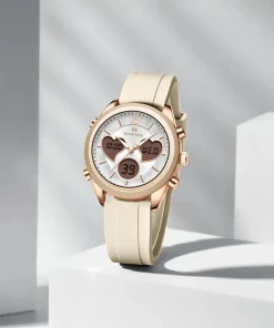 ساعت اورجینال زنانه نیوی فورس Naviforce NF5045 RG/W/BG یک ساعت دیجیتالی زیبا و جذاب از کالکشن 2026 است که برای استفاده روزمره طراحی شده است. این ساعت نیوی فورس با بند رابر سیلیکونی، حس راحتی و زیبایی را به شما هدیه میدهد. صفحه گرد سفید، همراه با قاب رزگلد فلزی، ظاهری شیک و مدرن به این ساعت ناوی فورس بخشیده است. نیوی فورس دارای ویژگیهایی مثل نمایش ساعت، تاریخ و کرونومتر با نور پس زمینه است.