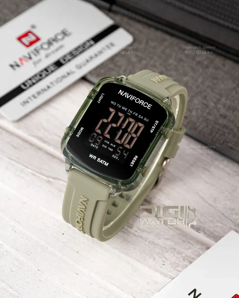 این مدل از نیوی فورس برای خانمهایی طراحی شده که دوست دارند در عین سادگی، خاص باشند. رنگ سبز خاص بند و قاب، در کنار صفحه دیجیتالی مشکی، ترکیبی چشمگیر ایجاد کرده که با لباسهای اسپرت، استایل روزمره یا حتی تیپ دانشجویی کاملا هماهنگ است.