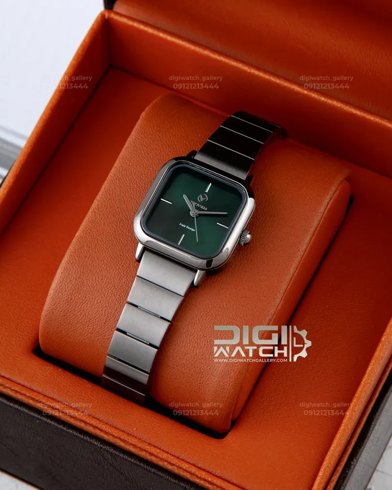 ساعتهای مربعی همیشه جلوهای خاص دارند و این مدل نیز با صفحه سبز رنگ و قاب فلزی در رنگهای مشکی و دودی، جلوهای مدرن و در عین حال کلاسیک ایجاد کرده است.
